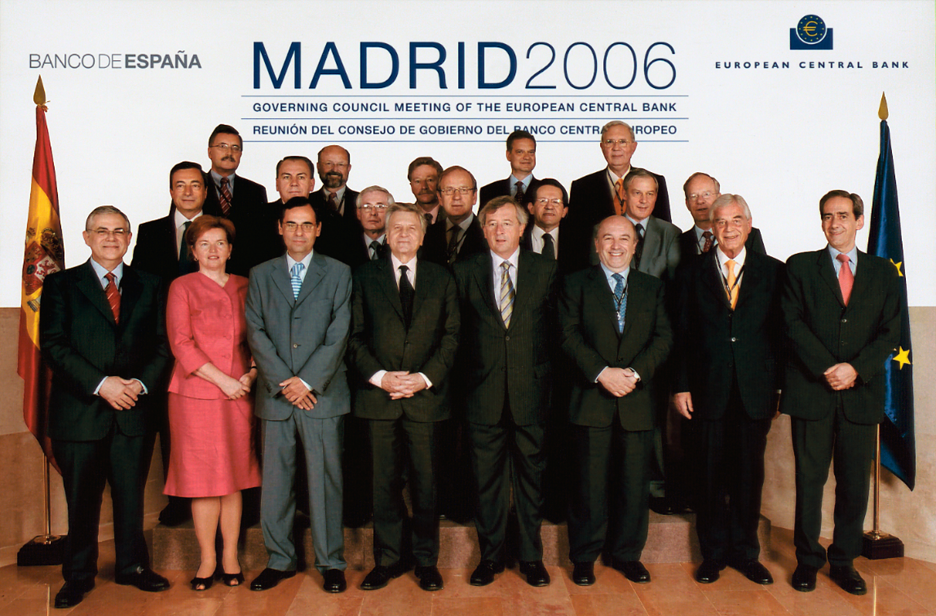 -Los gobernadores de los bancos centrales de la eurozona durante la reunión del Consejo de Gobierno del Banco Central Europeo celebrada en Madrid en 2006. Imagen digital.