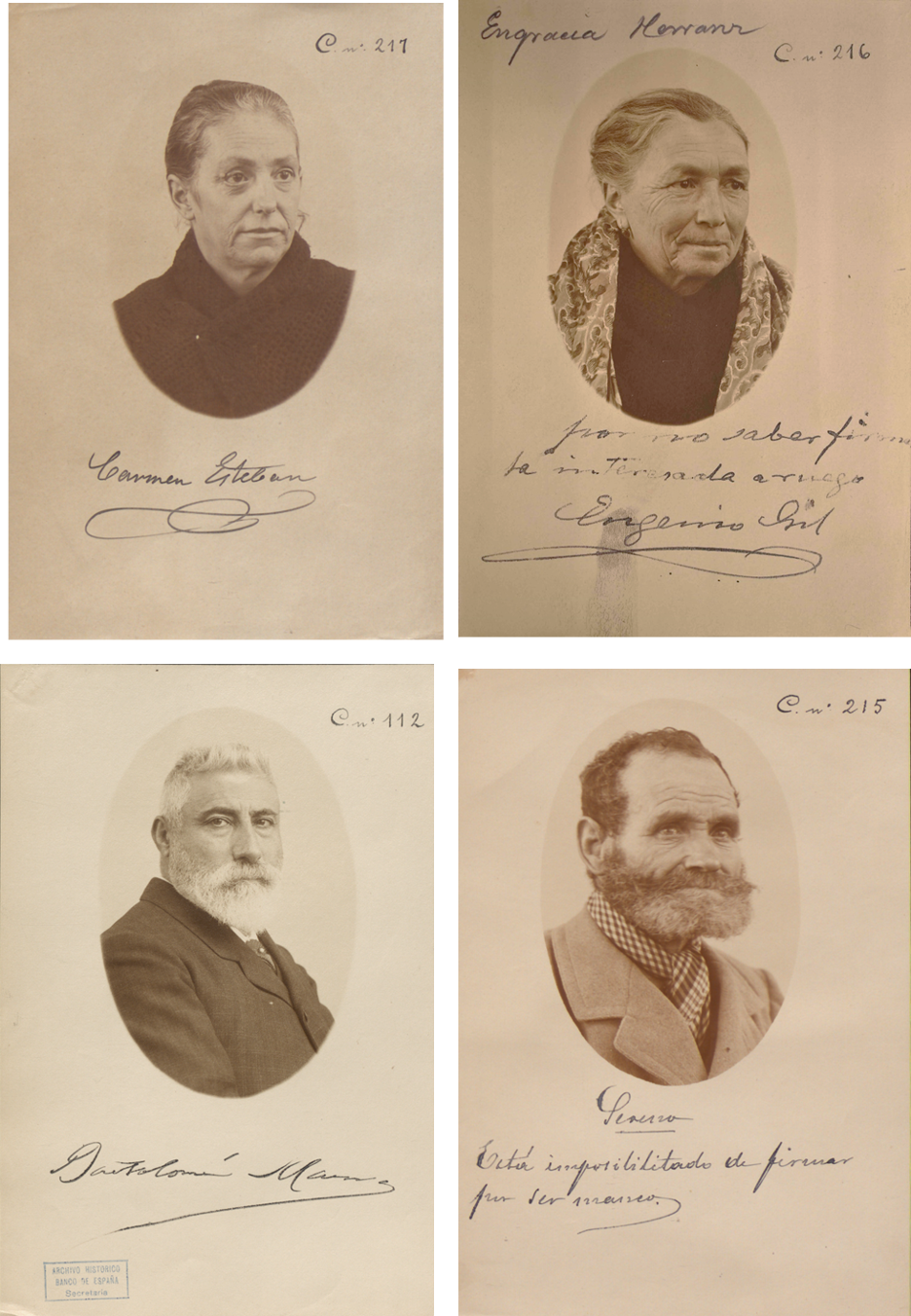 En 1905 cerca de 300 empleados fueron fotografiados. Son los primeros retratos del personal del Banco que conocemos. Se retrata al personal de los oficios relacionados con la seguridad. Entre ellos hay imágenes imponentes, como la del grabador de billetes, Bartolomé Maura. Rostros de otro tiempo, como el del sereno del edificio, José Sotillo, y las imágenes inéditas de las dos primeras mujeres empleadas del Banco de España, Carmen Esteban y Engracia Herranz (composición 2). Ambas empezaron a trabajar en el Banco en 1901 y estaban destinadas al servicio de limpieza –en aquella España el oficio más habitual para las mujeres. Sus fotografías representan la imagen de cualquier mujer de las clases populares del Madrid de principios del siglo XX. Sus rostros, con signos de cansancio y vejez prematura, y sus miradas, entre tiernas y sorprendidas por la cámara, reflejan un pasado difícil para estas mujeres, y no tan lejano ni ajeno.