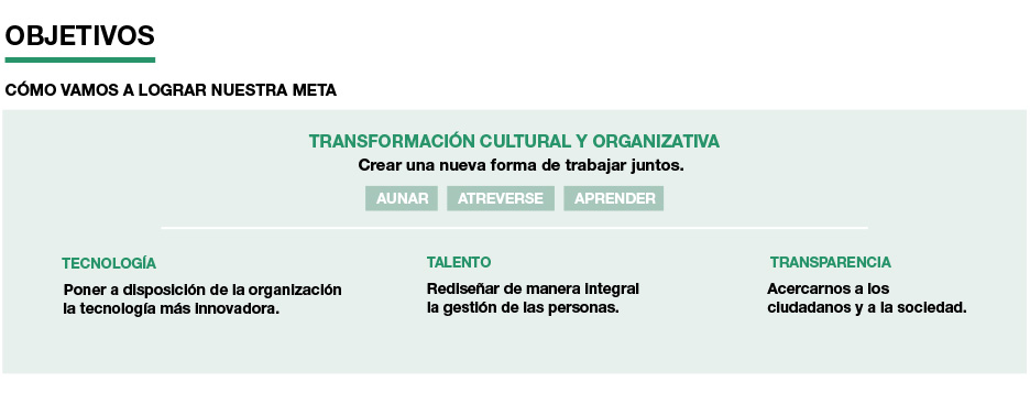 - Un marco estratégico, que comprende misión, visión, valores y objetivos. Se puede consultar el detalle en las imágenes inferiores.