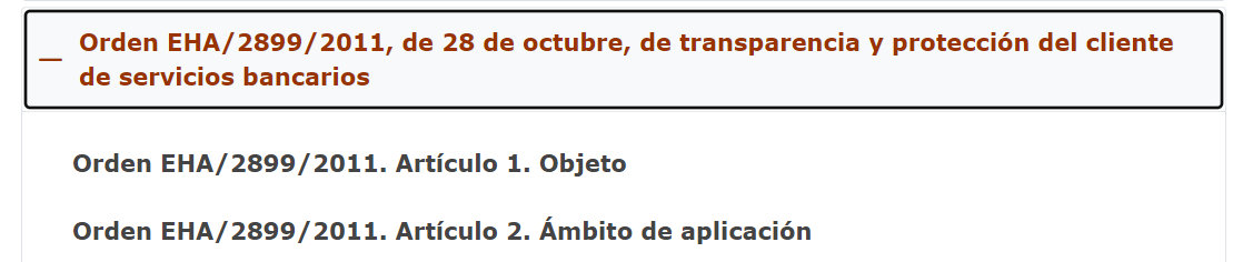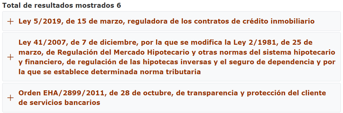 Los resultados, dentro de cada categoría, aparecen ordenados según su fuente normativa, en primer lugar, se muestran los textos legales, posteriormente las normas reglamentarias, seguidas de las circulares del Banco de España y de las guías supervisoras y, por último, los criterios de buenas prácticas.
