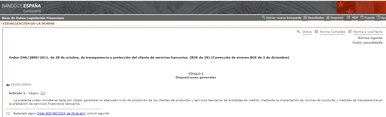Este resultado indica el artículo y el nombre completo de la norma o de la guía supervisoras. Si se selecciona sobre la línea gris, se abrirá una ventana donde se puede ver el texto completo del artículo, en la base de datos de legislación financiera del Banco de España, tal como se muestra a continuación: