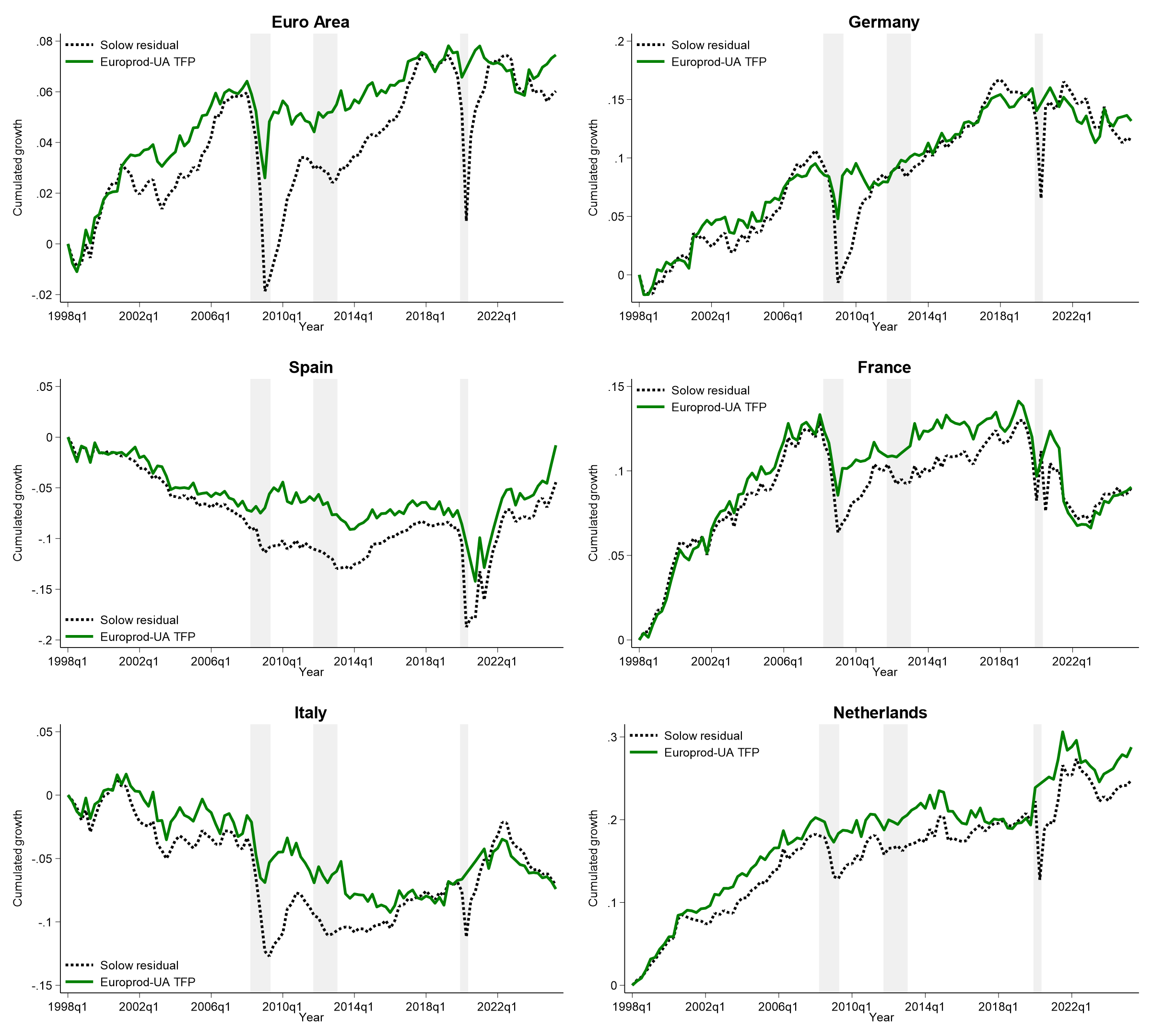This figure plots the EUROPROD-UA quarterly measure of cumulated TFP growth against a quarterly Solow residual. Shaded areas mark recessions. All series are normalized to zero in 1998Q1. Growth rates between 2020Q2 and 2020Q4 are interpolated to account for the impact of the Covid-19 pandemic.