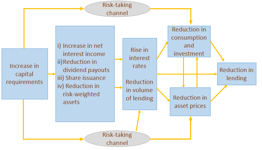 The activation of this capital requirement ensures that banks take actions (e.g. lowering the volume of lending and raising rates, taking on less risk) that moderate the credit cycle. This also results in a lower intensity of the real business cycle (consumption and investment) and a downward correction to financial asset prices, which in turn further moderates the credit cycle.