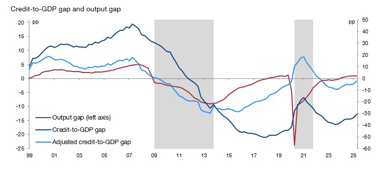 (443 KB)”. Documentos Ocasionales, 1603, Banco de España. The credit-to-GDP gap is calculated as the percentage point difference between the observed ratio and its long-term trend calculated by applying a one-sided Hodrick-Prescott statistical filter with a smoothing parameter equal to 25,000. This parameter is calibrated to match the financial cycles historically observed in Spain. See Jorge E. Galán. (2019). “Measuring credit-to-GDP gaps. The Hodrick-Prescott revisited