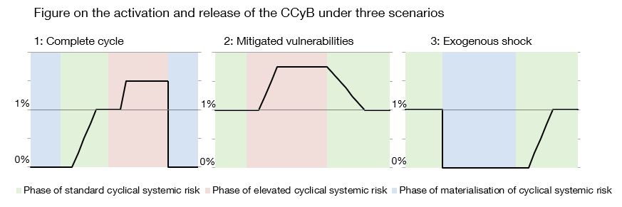 When these high systemic risks are mitigated and return to a standard level, the CCyB will be gradually released until it reaches 1% (see panel 2 of the figure).