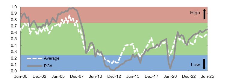 Note: Key indicators for monitoring cyclical systemic risk are aggregated in a single composite indicator. The white line depicts an aggregation through simple averages and the grey line an aggregation based on principal component analysis (PCA). Both aggregation methodologies are described in Ángel Estrada et al. (2024). “Analysis of cyclical systemic risks in Spain and of their mitigation through countercyclical bank capital requirements