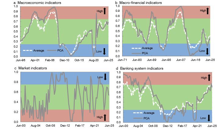 . Each indicator is defined, on a scale between 0 and 1, based on its percentile relative to its historical distribution. The blue (green) [red] range corresponds to a low (standard) [high] cyclical systemic risk level or, in the case of banking system indicators, capital generation capacity by the banking system.