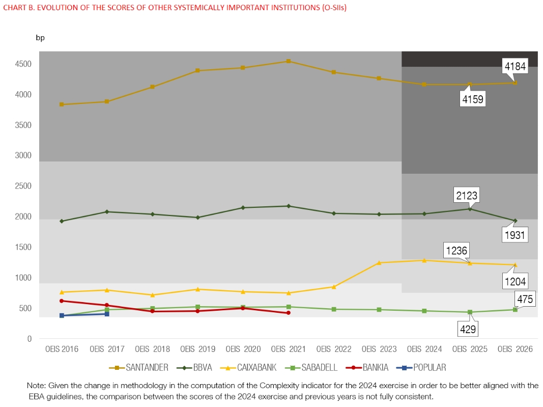 Notes: 1) Banco Popular was acquired by Santander in June 2017 and Bankia merged into CaixaBank in March 2021. 2) The shadings show the subcategories that determine the O-SIIs buffer rate applicable to each institution depending on their score (0.25%, 0.5%, 0.75%, 1%, 1.25% and 1.5%). 3) Latest data have been obtained in the exercise performed in 2025, based on data at end-2024, to determine the list of O-SIIs and their buffer rates applicable in 2026. 4) Given the change in methodology in the computation of the Complexity indicator for the 2024 exercise in order to be better aligned with the EBA guidelines, the comparison between the scores of the 2024 exercise and previous years is not fully consistent.