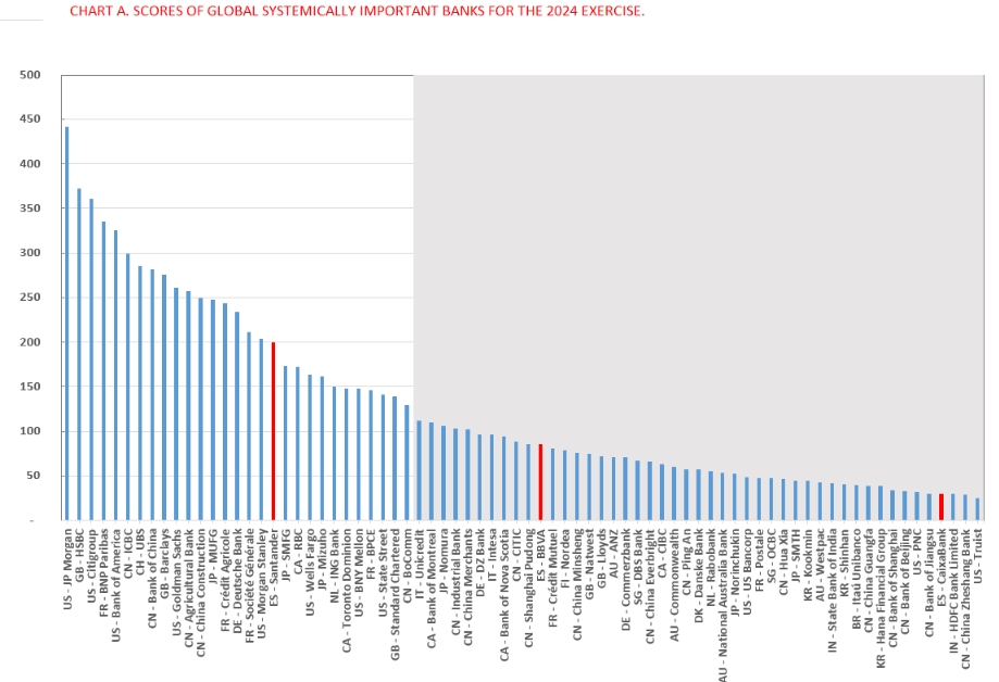 Notes: 1) The institutions of the shaded area (score lower than 130 bp or expert judgement) are not considered G-SIBs/G-SIIs. 2) Identification performed by the Basel Committee on Banking Supervision in 2024 (based on data at the end of 2023) to establish the list of G-SIBs and their associated macroprudential capital buffer rates for 2026.