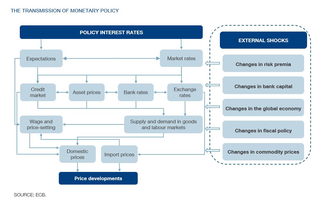 - Change in policy interest rates: the central bank adjusts its policy interest rates. In the euro area, the European Central Bank (ECB) holds monetary policy meetings every six weeks, where it decides whether to change or maintain its policy interest rates and whether to implement other monetary policy instruments.