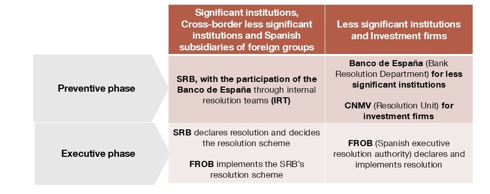At EU level, Regulation (EU) No 806/2014 on the SRM (SRM Regulation) stipulates that the SRB is in charge of drafting resolution plans and adopting all decisions on the resolution of significant and cross-border less significant institutions and groups and Spanish subsidiaries of foreign groups within the euro area. Implementing these resolution actions, however, is the preserve of the national executive resolution authority. Nevertheless, the SRB can require national resolution authorities to prepare and submit, or help draw up, draft resolution plans for institutions under their remit and has indeed done so in the past with the Banco de España.