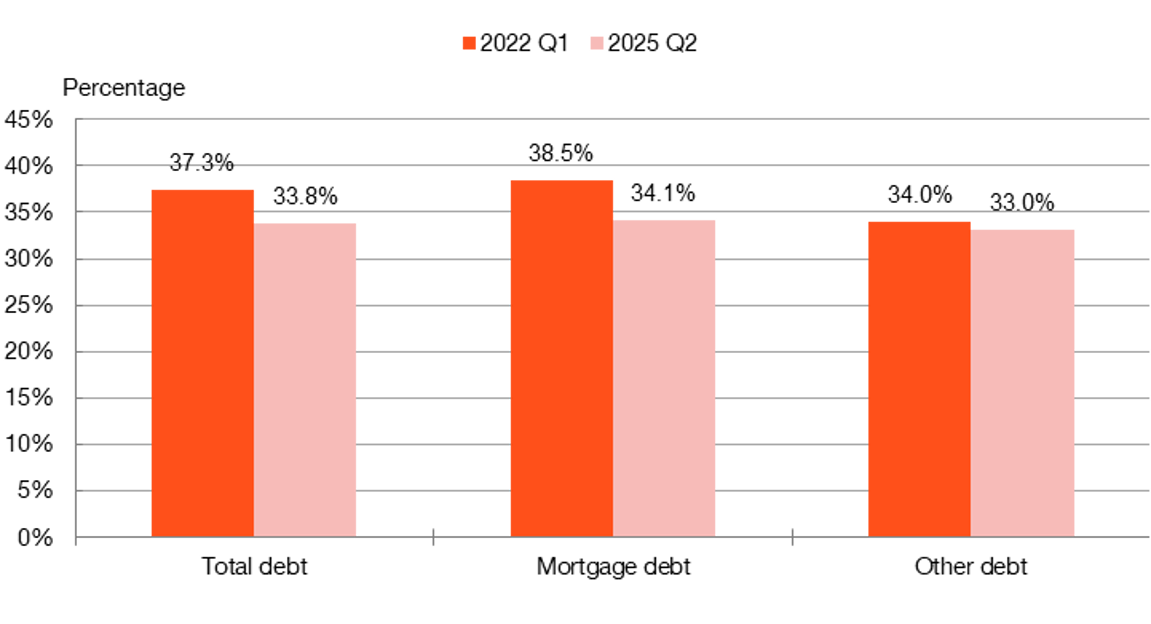 Chart 2 highlights a final point: the relative reduction in the debt of the 50% least wealthy households is due to the sharper decline in these households' mortgage debt (from 57.6% to 34.1%) than in their other debt (just 36.4% to 33%).