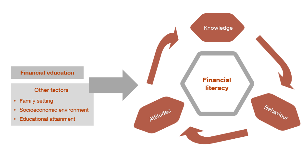 When we talk about “financial literacy”, we mean more than just financial and economic knowledge. As Figure 1 shows, other aspects, such as your behaviour and your attitudes also play a part.