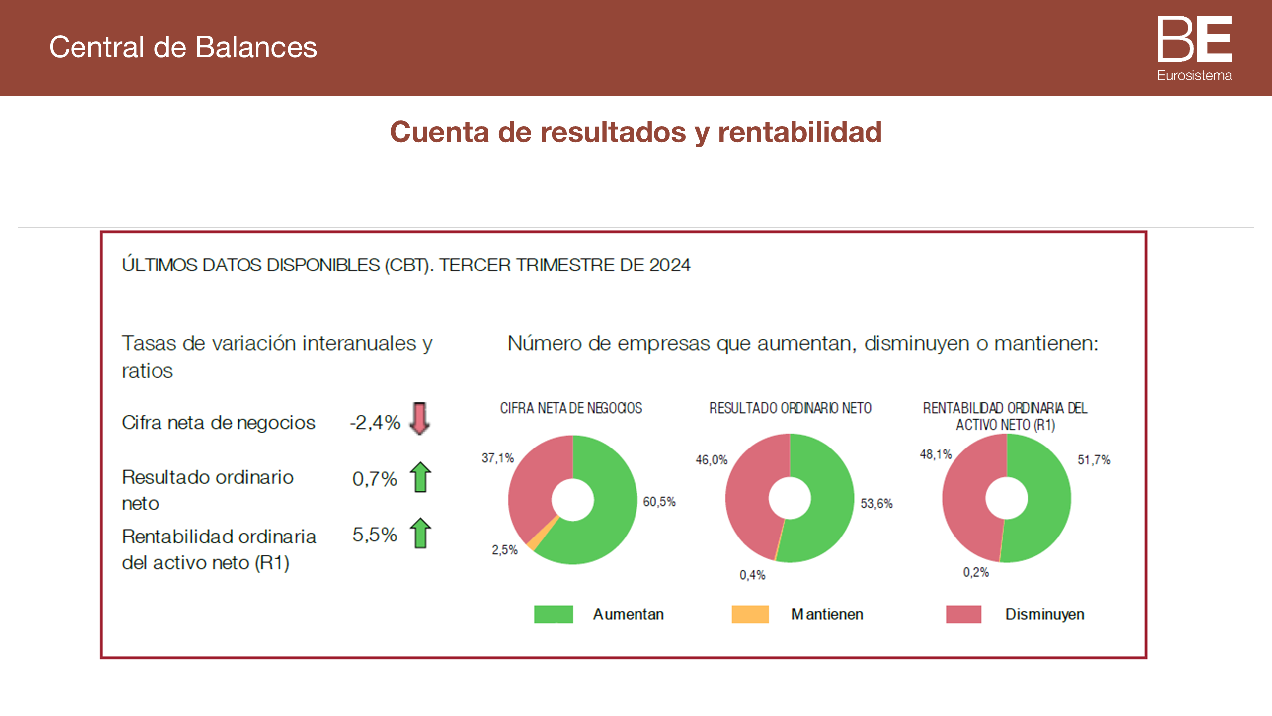 El resultado ordinario neto y la rentabilidad del activo de la muestra anual de Central de Balances crecieron en 2023, aunque disminuyó la cifra de negocios. El aumento se mantuvo en los tres primeros trimestres de 2024, aunque de forma más moderada.