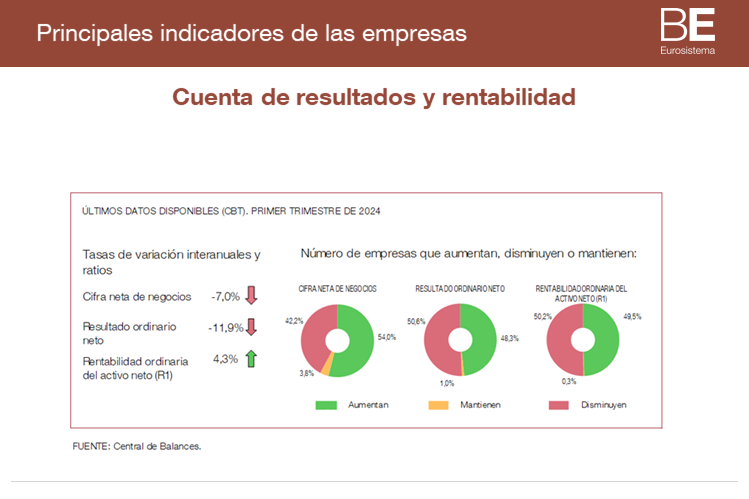El resultado ordinario neto de las empresas no financieras de la muestra trimestral de Central de Balances (CBT) disminuyó en el primer trimestre 2024 un 11,9% respecto al primer trimestre de 2023, en un contexto de caída de la cifra de negocios.  La evolución de esta última se vio condicionada por el descenso de los precios de venta de los sectores relacionados con la energía.