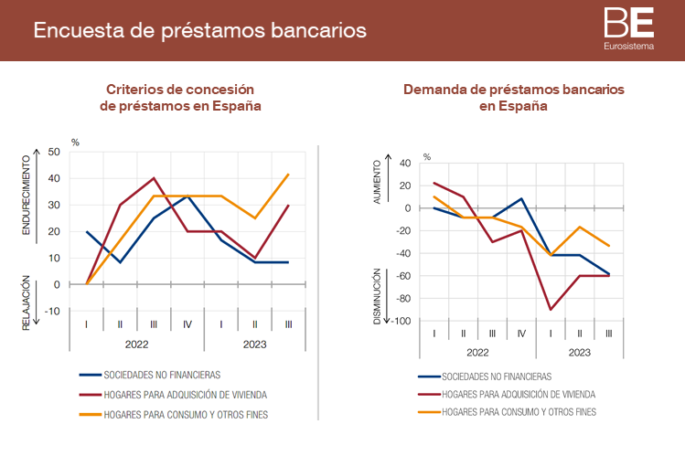 Según la Encuesta de Préstamos Bancarios, en el tercer trimestre de 2023, tanto los criterios de concesión como las condiciones generales aplicadas a los nuevos préstamos se habrían seguido endureciendo, de forma generalizada, por sexto trimestre consecutivo.