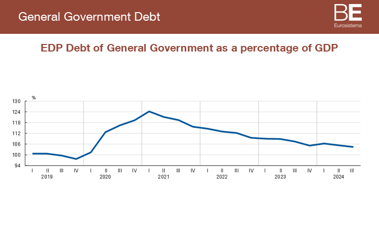 General government debt fell to 104.4% of GDP in 2024 Q3, three percentage points lower than a year ago
