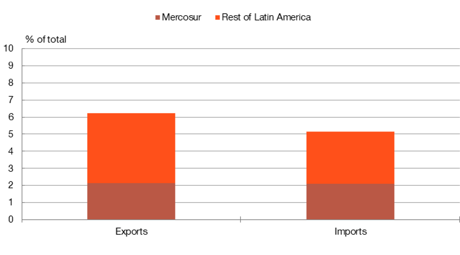 The deal will open up trade between two regions that have strong economic ties. As Chart 1 shows, the EU accounts for over 10% of Mercosur’s trade. While Mercosur only accounts for 2% of the EU's external trade, there are specific and strategic sectors, such as food and commodities, in which its accounts for 13% and 14%, respectively, of EU imports.