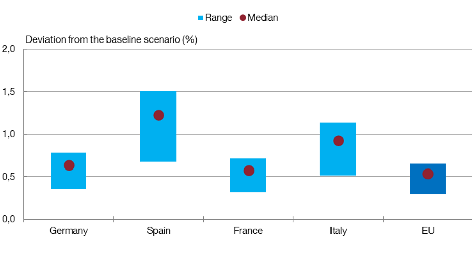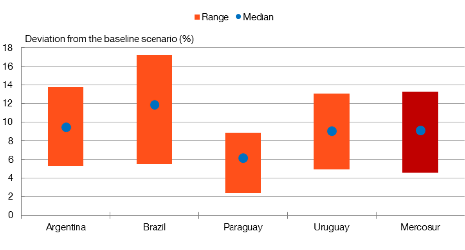 NOTES: The baseline scenario does not consider the trade agreement. The range and the median have been calculated drawing on the results of the simulations in Timini and Viani (2022)