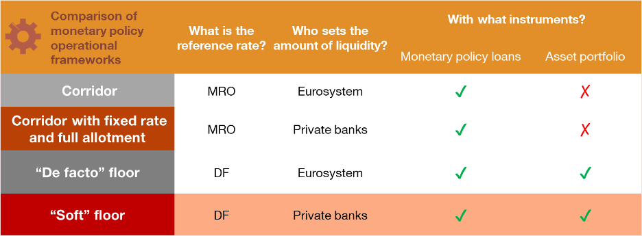 The monetary policy operational framework has gone through successive phases or systems: corridor, fixed-rate full allotment corridor, “de facto” floor and the recently announced “soft” floor