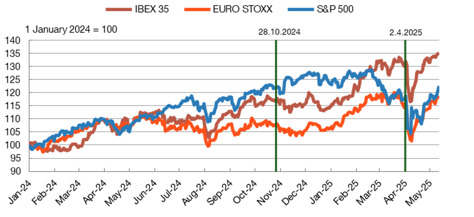 NOTES: 28 October 2024 is the cut-off date for the last Financial Stability Report; 2 April 2025 is 'Liberation Day', when the sweeping tariff hike was announced by the United States. Latest observation: 12 May 2025.