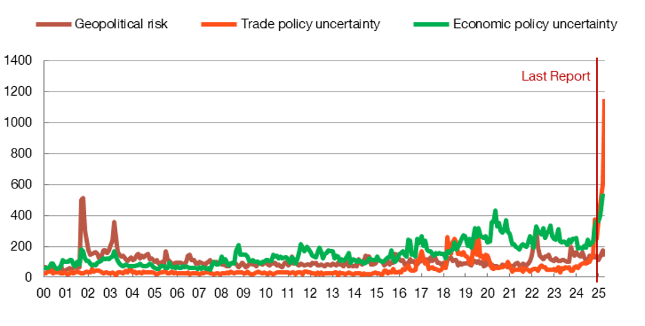 . Latest observations: April 2025 (geopolitical risk and trade policy uncertainty) and March 2025 (economic policy uncertainty).