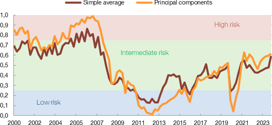 NOTE: Data updated at December 2023. The brown line shows the aggregation using simple averages of the risk indicators and the orange line the aggregation using principal components. A principal component is a statistical indicator