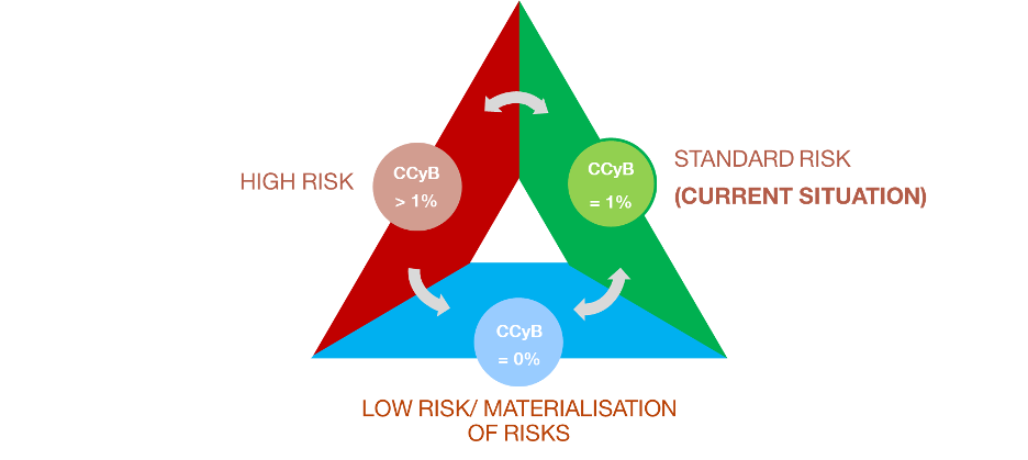 The countercyclical capital buffer (CCyB) mitigates the risk posed by the macro-financial cycle to the banking system as a whole. The CCyB gradually raises banks’ solvency requirements when this risk is intermediate or high and lowers them when such systemic risks materialise. In so doing, it enhances banks’ loss-absorbing capacity and enables a stable supply of financing to the economy.