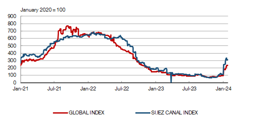 NOTE: The global index (Freightos Baltic Global index) measures the cost of maritime container transport on 12 key routes. The Suez Canal index is the Freightos China to Mediterranean index focusing on the route passing through the Suez Canal. The figures are daily. Latest figure: 25 January 2024.