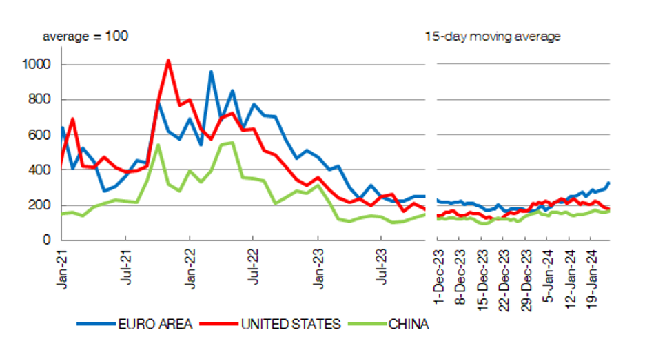 NOTE: The bottleneck index measures the proportion of newspaper items reporting supply problems and and its average up to December 2021 is set to 100 (Burriel et al., 2024). The euro area index is calculated as the average of the national indices for Germany, France, Italy and Spain. Latest data: 24 January