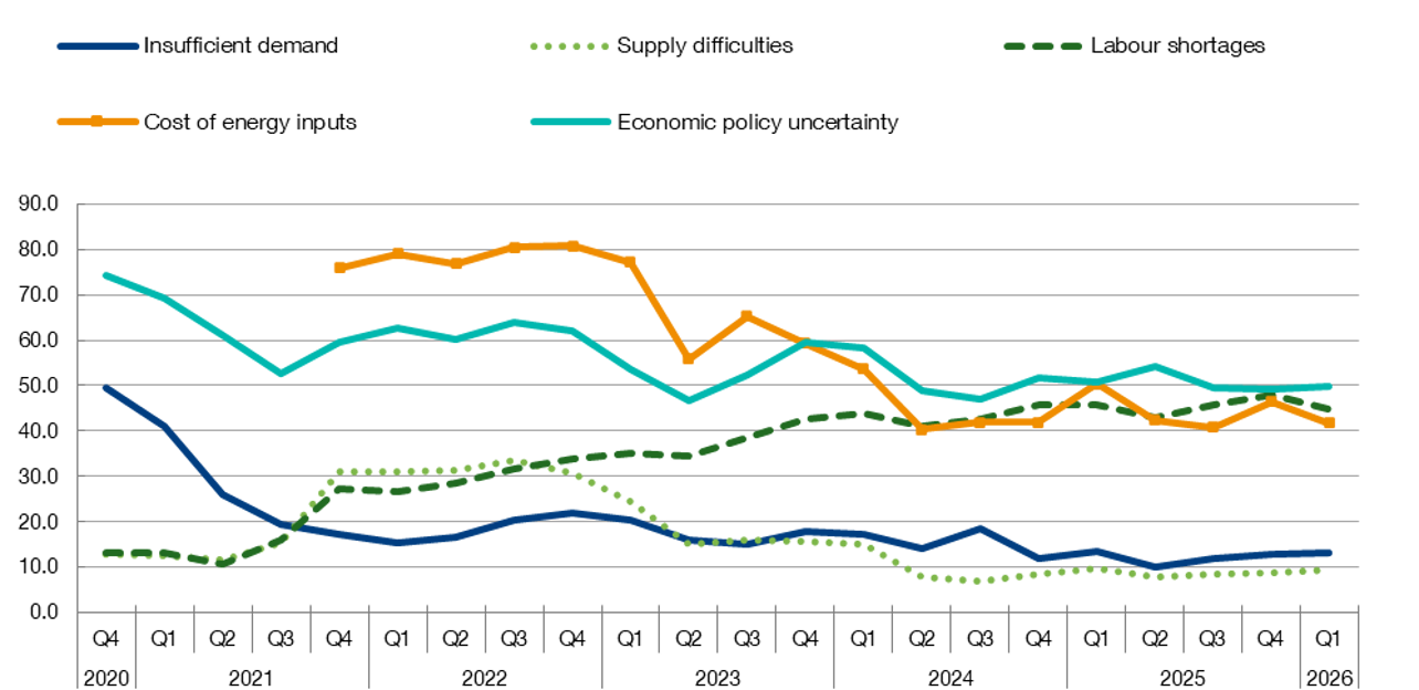 By way of example, Chart 1 shows the sizeable changes firms have perceived in the constraints on their activity over the last two years. Economic policy uncertainty and labour shortages are two constraints that they have singled out in their recent responses, including in the latest survey (2026 Q1)