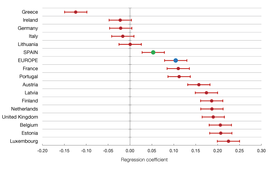-Each dot represents the regression coefficient, i.e. the conditional correlation, between the potential AI exposure of the various jobs in a country and the changes in their share in total employment from 2011 to 2019. The whiskers show the standard error range for a 95% confidence interval. Where the whiskers intersect with the zero line, the effect is not statistically significant.