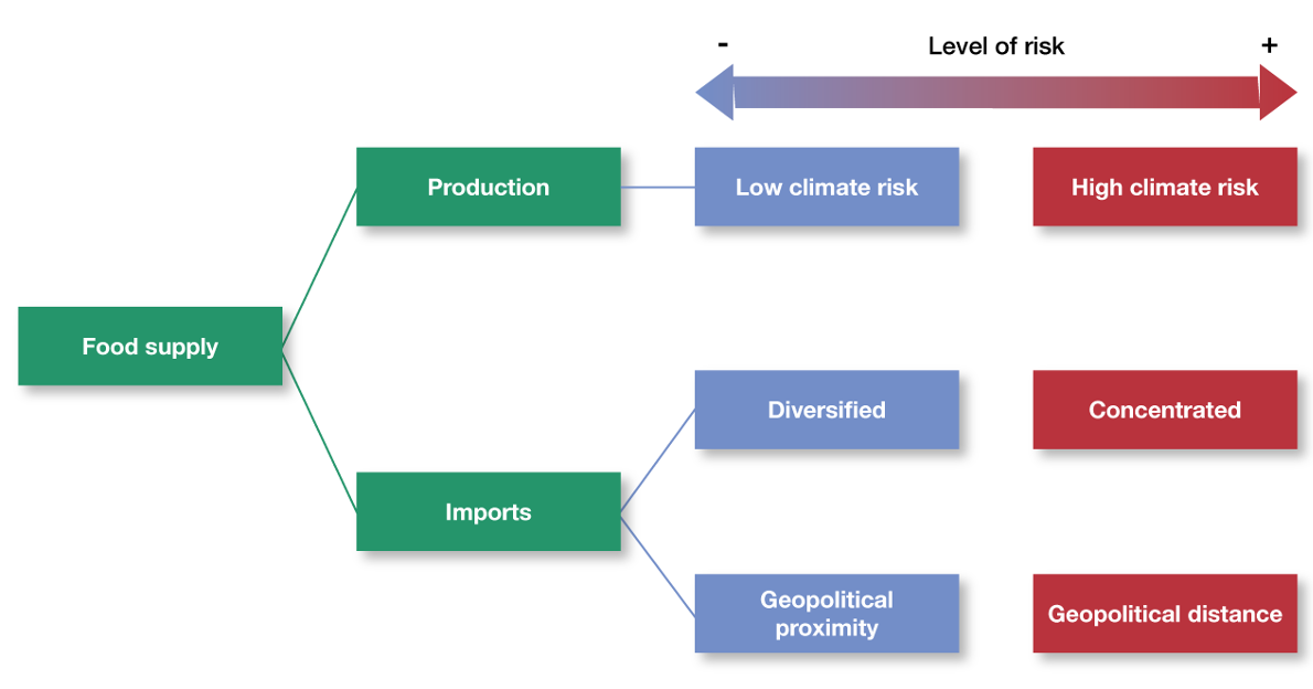 However, as shown in Figure 1, risks to food security and to a stable food supply persist. Climate risk affects both production and imports, while other foreign trade-related risks include product concentration among just a few supplier countries and geopolitical frictions.
