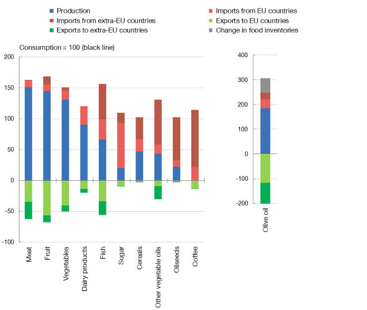 NOTES: How to interpret the chart: Consumption (at 100 in all cases) and inventories equal production and imports/exports. Spain produces slightly more than 150% of the amount of meat it consumes, meaning that it exports the equivalent of more than half its consumption to both EU and extra-EU countries. It also imports some meat (around 10% of consumption). The bars in the columns add up to 100, as there are no food inventories, except in the case of olive oil.