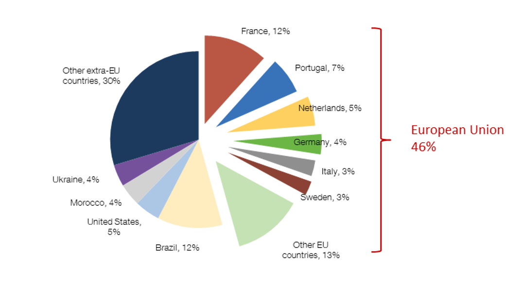 As Chart 2 shows, 46% of Spain’s food imports come from the EU, mainly from France (12% of total imports), followed by Portugal and the Netherlands. Brazil is Spain’s leading extra-EU food supplier (12%), followed at a considerable distance by the United States, Morocco and Ukraine.