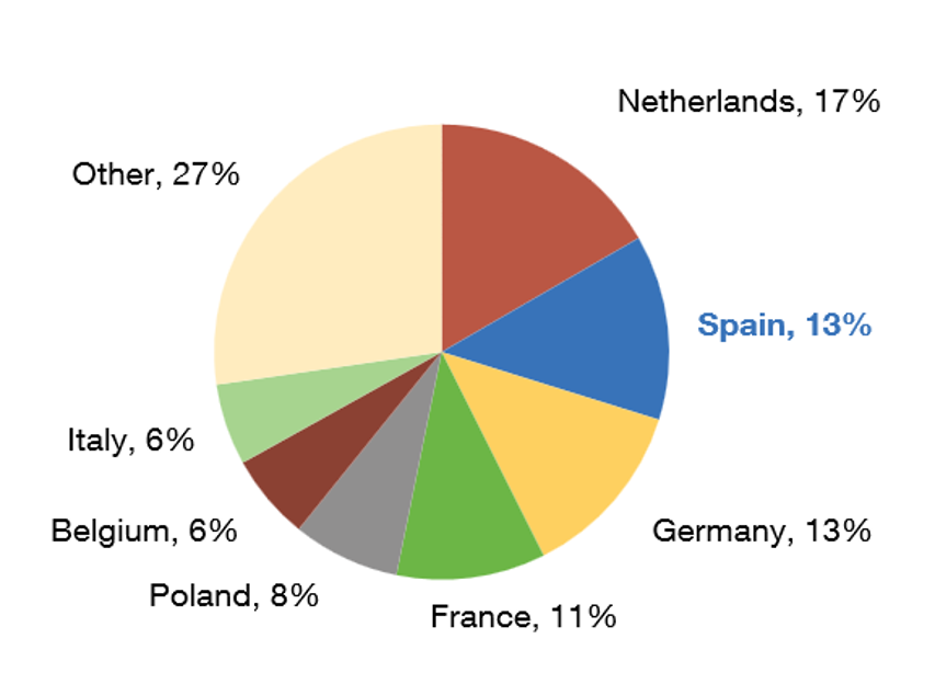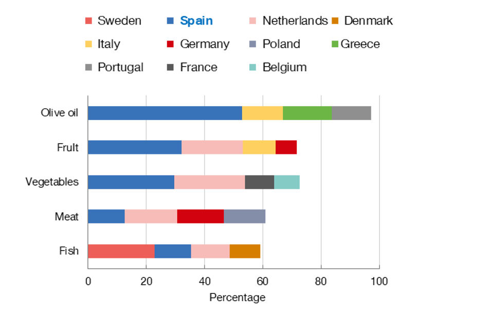 Spain is the second largest exporter of food commodities in the EU and the leading supplier of fruit, vegetables and olive oil