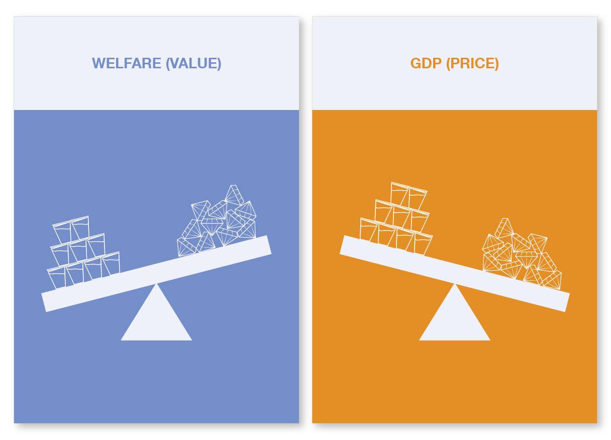 There is a critical matter in GDP measurement: the meaning of prices, which play a critical role. Prices often reflect the scarcity of some goods in relation to others, not necessarily their contribution to welfare. For example, although water is essential for life, it is much cheaper than diamonds, as the latter are very scarce, relatively speaking. Therefore, relative to the welfare they provide, water's contribution to GDP is tiny, while that of diamonds is very high (see Figure 2).