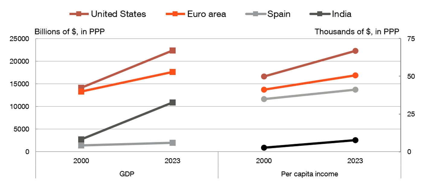 NOTE: Figures expressed in purchasing power parity (PPP) in dollars ($). The difference between the change in GDP and in per capita income owes to demographic developments. For regions with high population growth, such as India, the difference between the paths of each variable can be remarkable.