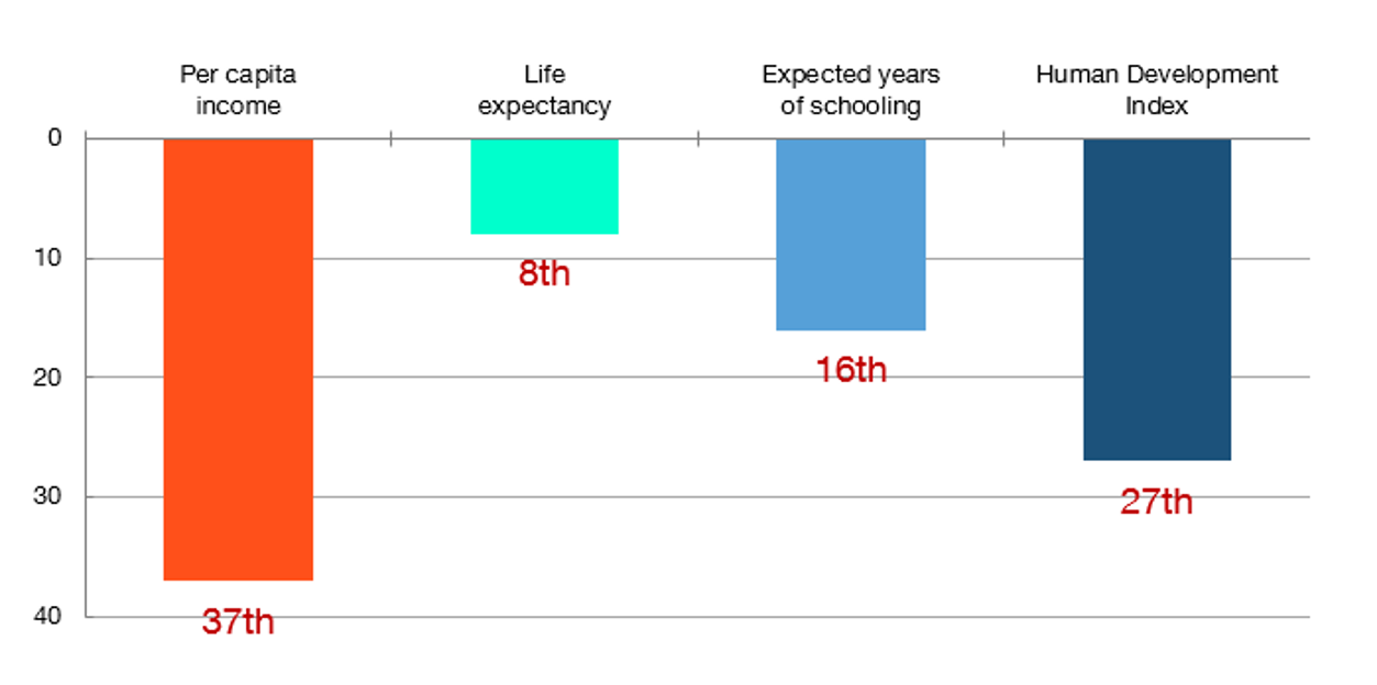 NOTES: The HDI aggregates various types of indicators in three areas: standard of living, education and health. Per capita income (or, more specifically, net national income) is the indicator for the standard of living; expected years of schooling are taken as the indicator for educational attainment; and life expectancy at birth is the indicator for health. The Human Development Index is the geometric average of the indicators used. The result is a ranking that should be interpreted with due caution.