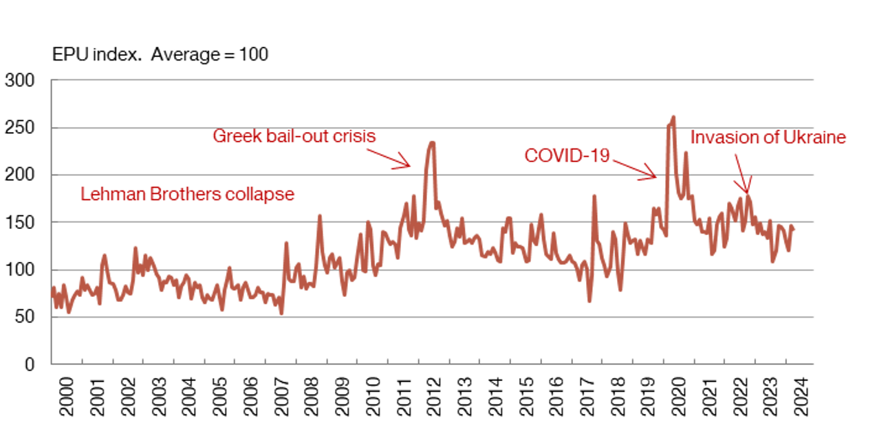 NOTES: The EPU index is a textual indicator of economic policy uncertainty. It calculates the percentage of news that mentions words related to "uncertainty" "economic" and "economic policy". It is expressed as the deviation from its historical average, which is equal to 100.