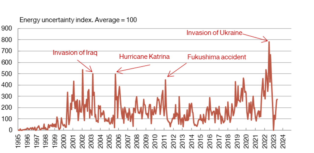 NOTE: The energy uncertainty index is calculated based on the percentage of news referring to uncertainty in relation to energy. The index is expressed as the deviation from its historical average, which is equal to 100.
