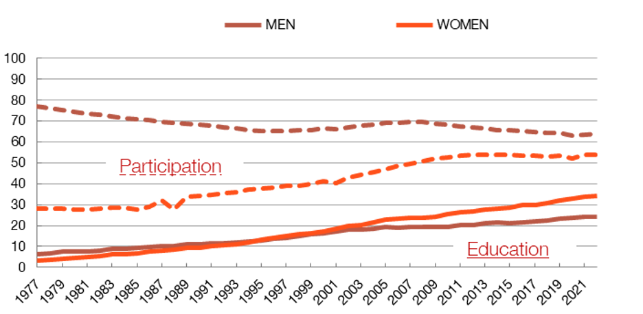 NOTE: Population with tertiary education and labour market participation rate by gender in Spain, 1977-2022.