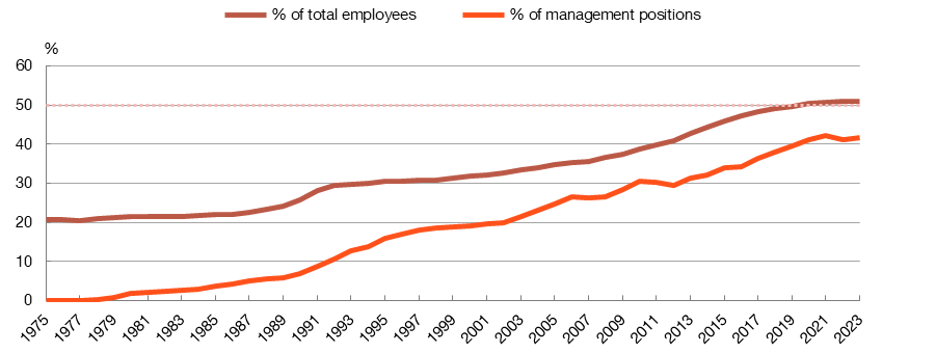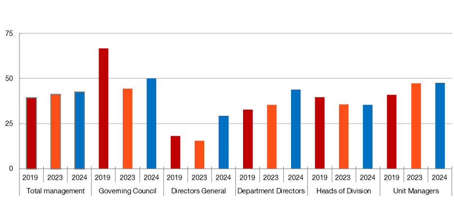 That said, the proportion of women in management positions has increased in recent years. Overall, the representation of women has only expanded from 39% to 43% since 2019, but there has been a notable leap in the higher spheres, especially in the last year: the percentage of female directors general and associate directors general has almost doubled to 39% and female directors and deputy directors have risen from 35% to 44%.
