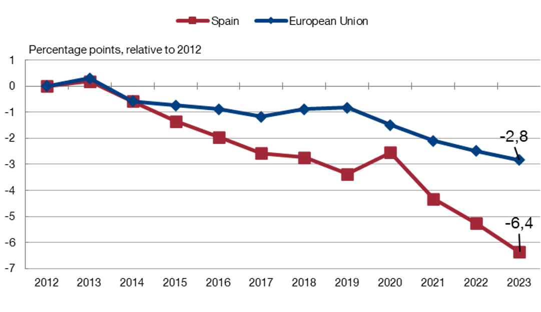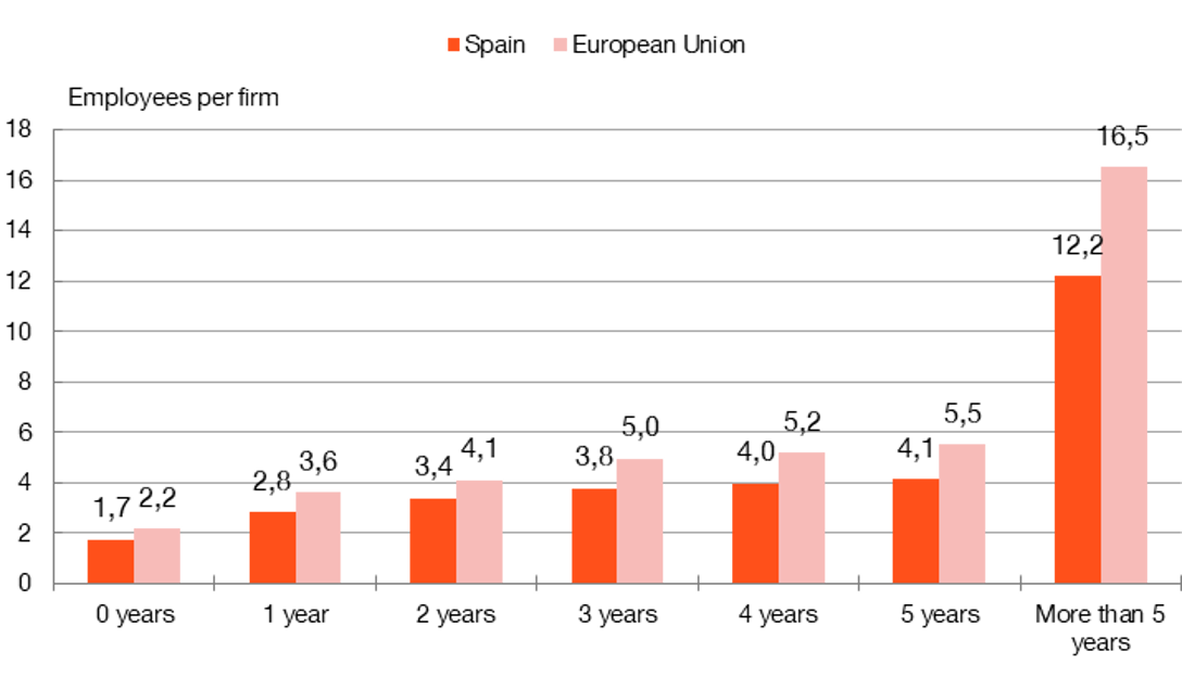 Analysis of the data tells us that Spanish firms had, on average, 8.8 employees in 2023, compared with 12.1 in the European Union (EU). The small average size of Spanish firms is mainly due to two factors: