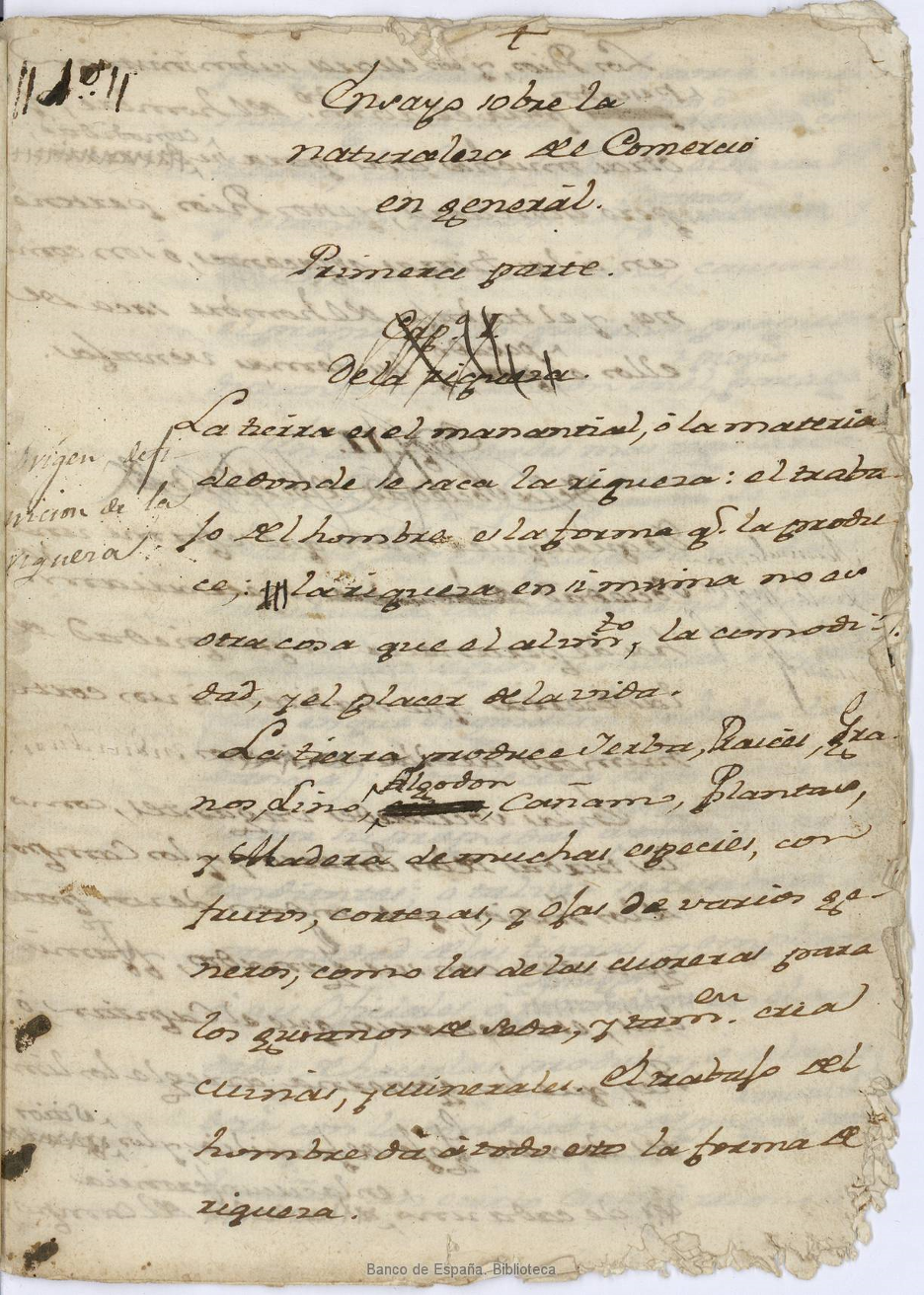 FIRST PAGE OF THE MANUSCRIPT OF CANTILLON'S ESSAI IN THE BANCO DE ESPAÑA’S LIBRARY