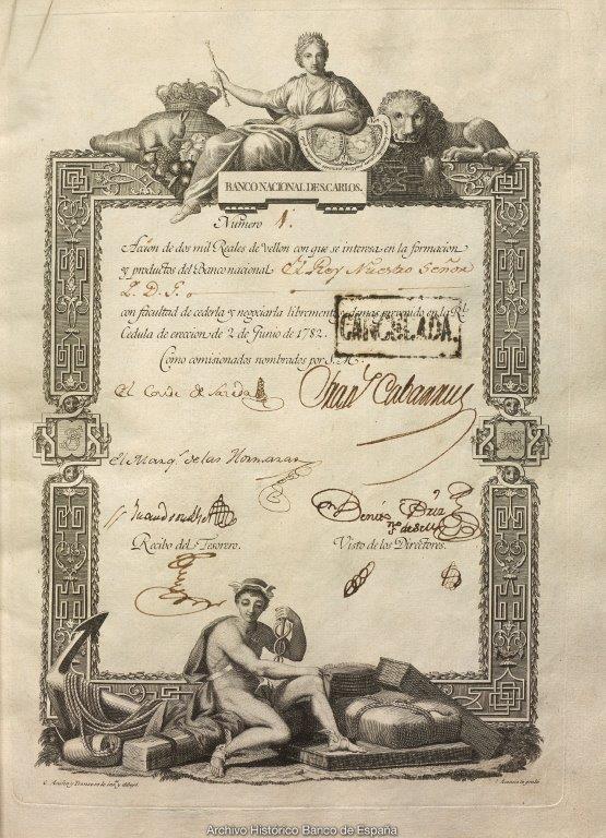 One of the most remarkable series in the Historical Archive is the set of shares issued by the Banco Nacional de San Carlos. This unique collection reveals the names of nearly every one of the bank’s founding shareholders and shows how ownership was distributed. The Banco Nacional de San Carlos issued 150,000 shares with a face value of 2,000 reales de vellón each, which were subscribed between 1782 and 1785 by individuals and institutions from every corner of society. These included the nobility, the military and the clergy, merchants, banking houses, towns and villages, cooperatives, associations, estates, chantries, charities, hospitals, individuals and a lengthy list of shareholders of all types, mirroring the society of the day.
