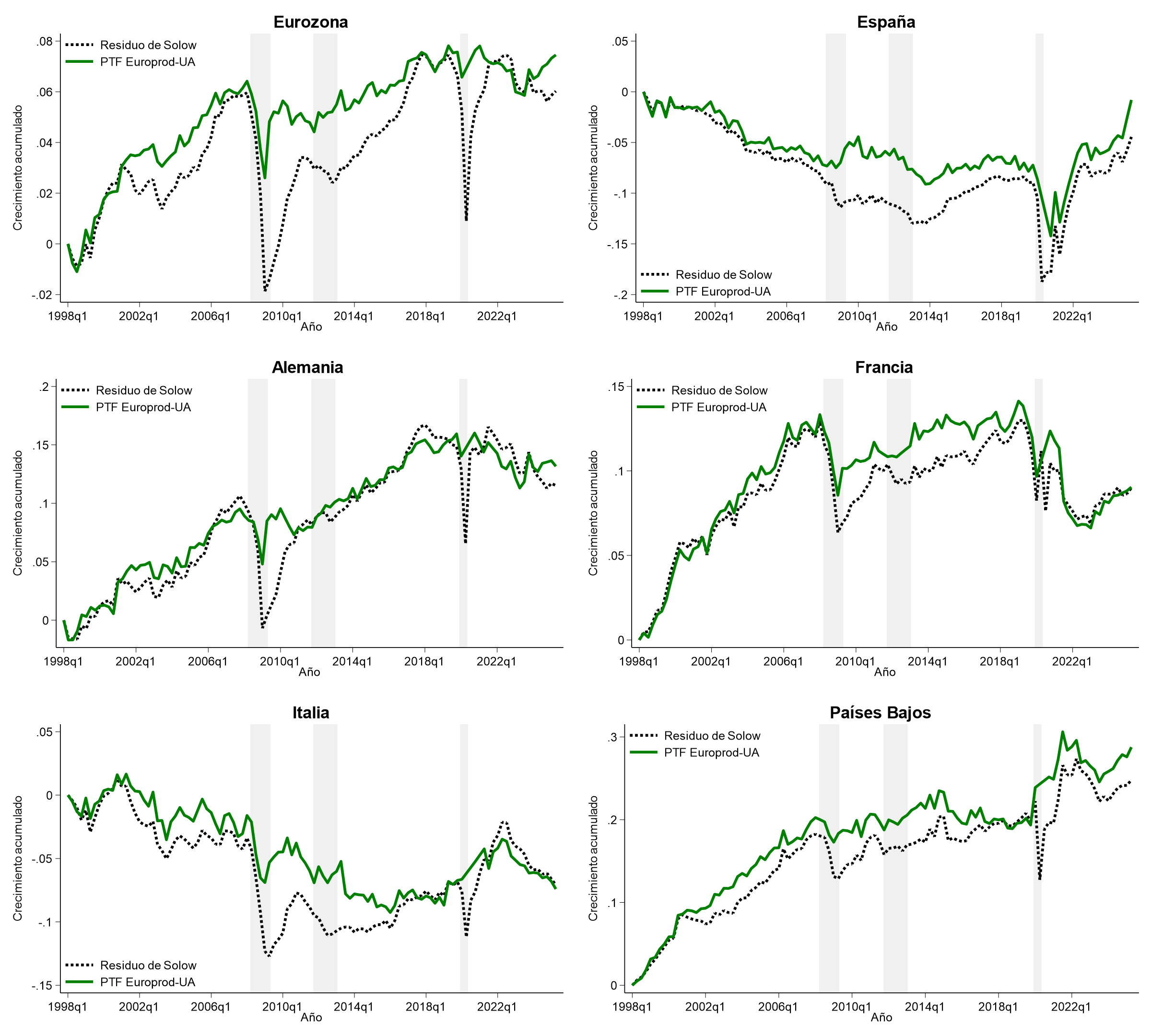 Esta figura muestra la serie EUROPROD-UA de crecimiento trimestral acumulado de PTF así como la serie trimestral del residuo de Solow. Todas las series están normalizadas a cero en 1998t1. Las zonas sombreadas señalan periodos de recesión. Las tasas de crecimiento entre el 2020t2 y 2020t4 están interpoladas para contabilizar el impacto de la pandemia.