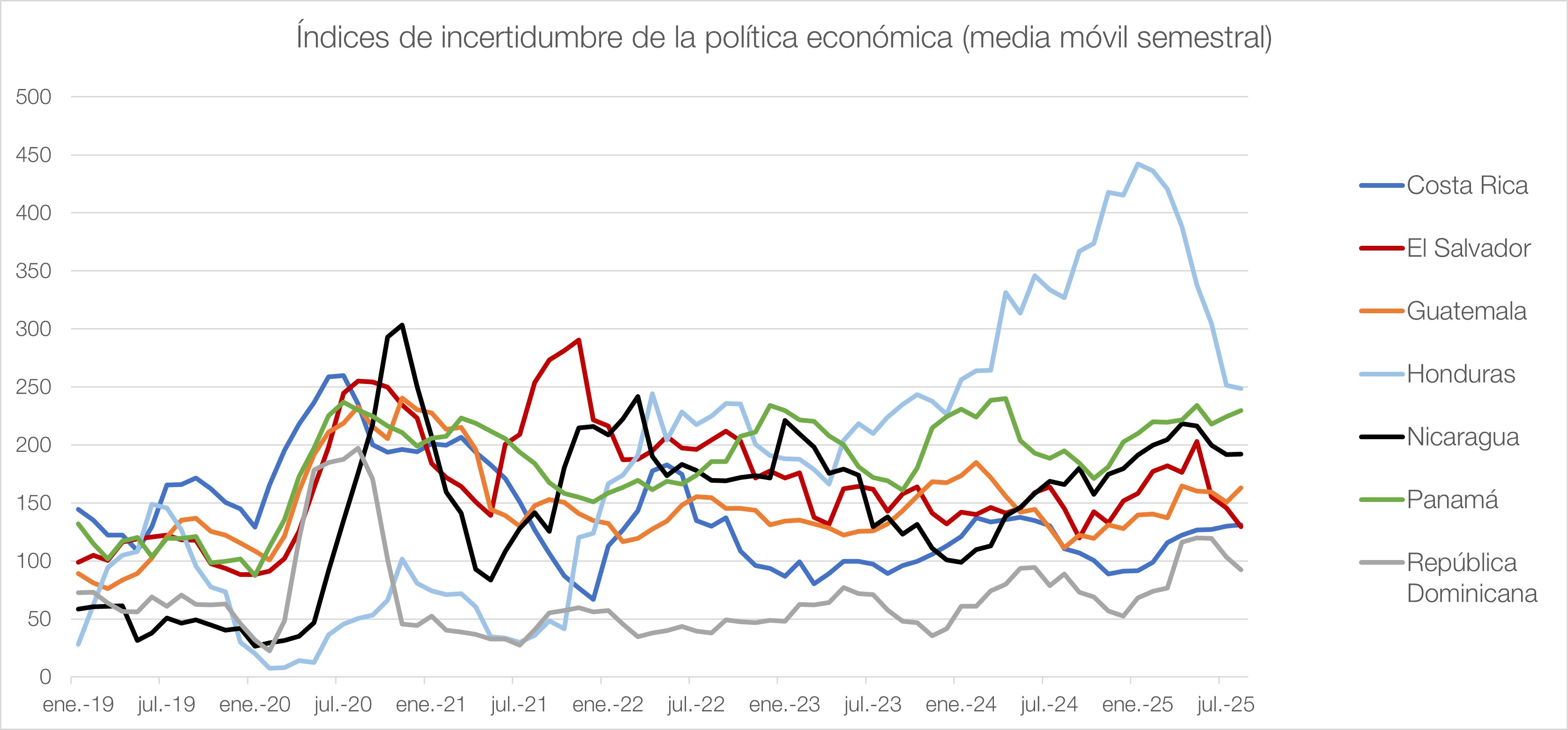 El Banco de España, en colaboración con la Secretaría Ejecutiva del Consejo Monetario Centroamericano (SECMCA), estima índices de Incertidumbre en Política Económica (EPU, por sus siglas en inglés) para los países de América Central y República Dominicana: Costa Rica, El Salvador, Guatemala, Honduras, Nicaragua, Panamá y República Dominicana.