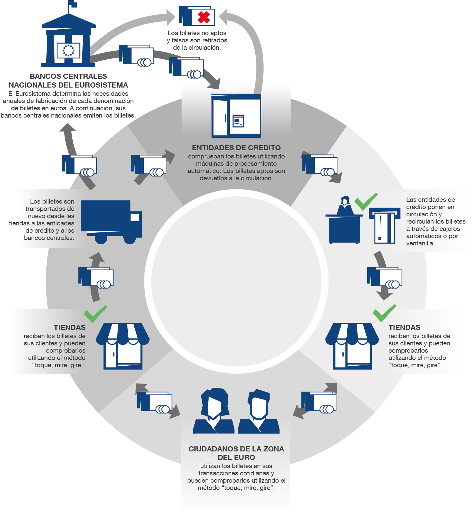 El dinero circula entre comercios, clientes y bancos. Aquellos billetes que no necesitan o que están deteriorados son devueltos por las entidades de crédito al Banco de España, que comprueba su autenticidad y aptitud para volver a la circulación. Los billetes falsos se retiran de la circulación. Por su parte, los billetes que no son aptos para la circulación se destruyen y se sustituyen por otros nuevos, y los que están en buen estado, vuelven a circular, lo que puede suceder varias veces si se mantienen en buenas condiciones. Y el ciclo comienza otra vez.