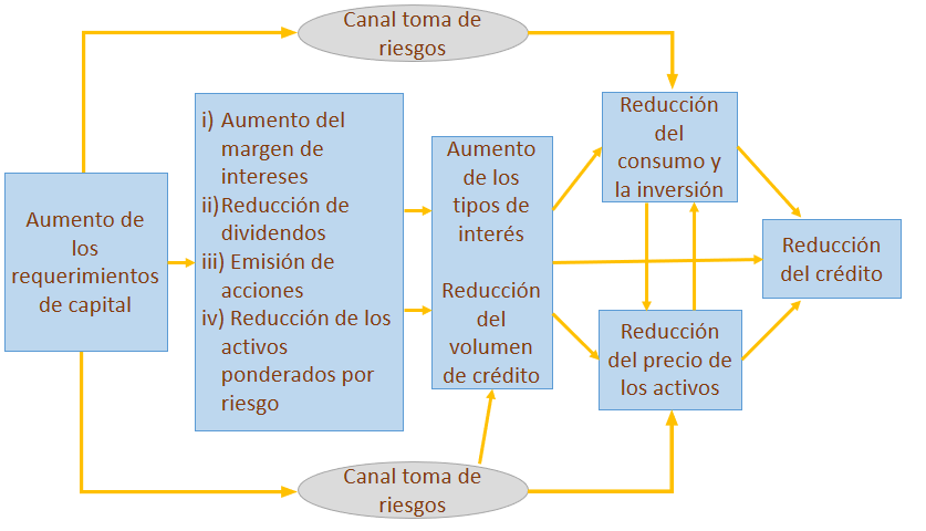 La activación de este requerimiento de capital hace que las entidades bancarias tomen acciones (e.g. reducción del volumen de crédito y aumento de tipos, asunción de menores riesgos) que moderan el ciclo de crédito. Esto se traduce también en una menor intensidad del ciclo real (consumo e inversión) y corrección a la baja de los precios de los activos financieros, lo que a su vez modera adicionalmente el ciclo de crédito.